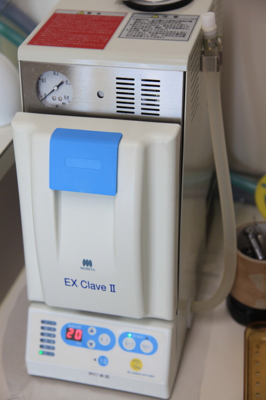 滅菌器はこの写真の物の他にもあり、2台体制で器具をキレイにしています。 |